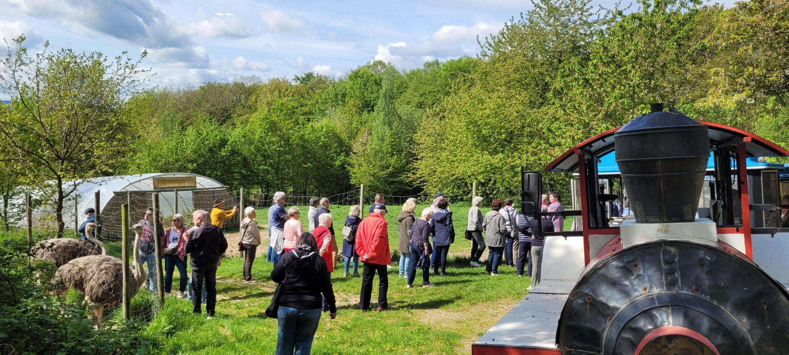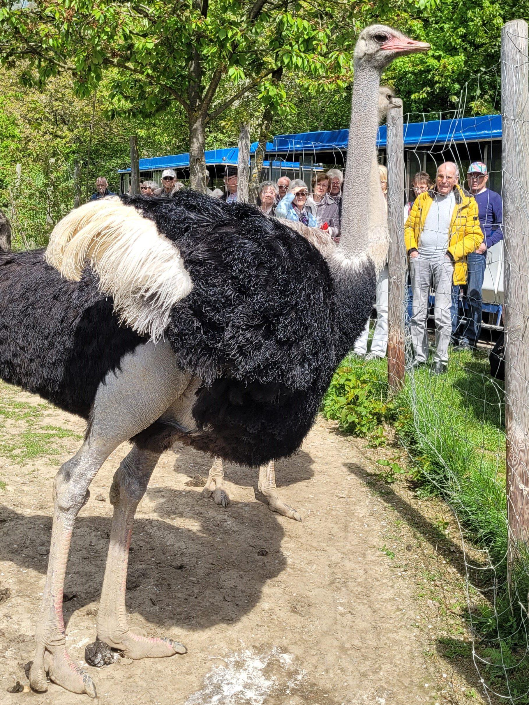 Wir wurden von Ralph Schumacher herzlich empfangen. Mit einer Bimmelbahn wurden wir durch das weitläufige Areal gefahren und erfuhren so manches über die Lebensgewohnheiten und Eigenschaften der Strauße, zum Beispiel, dass das Gehirn nicht größer als eine Walnuss ist. So verharren Strauße bei einem Regen- oder Schneeschauer an Ort und Stelle als sich schützend in den nahen Unterstand zu begeben, ziemlich dämlich. Der Schnabel besitzt keine Zähne und so schlucken Strauße alles bis zur Größe einer „Cola Dose“ herunter. Strauße verfügen über einen muskelösen Magen, schlucken Steine, die dabei helfen, die Nahrung zu zerkleinern…